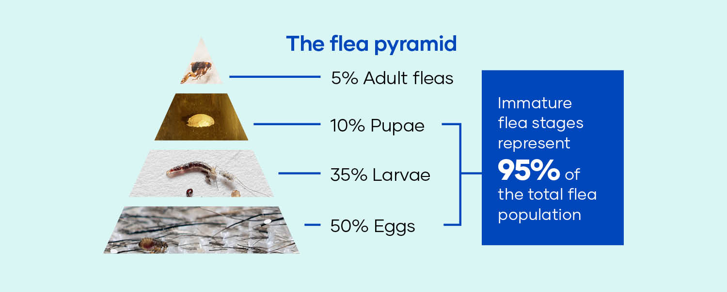 • 95% of fleas live in the environment (carpet, bedding, gardens etc) in various lifestages.